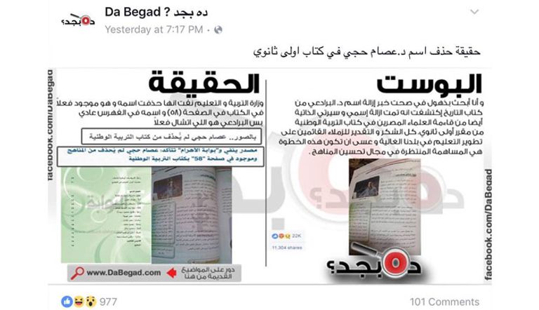 أما آخر الشائعات التي انتشرت بين رواد مواقع التواصل الاجتماعي خلال الفترة الماضية، فكانت حذف وزارة التربية والتعليم بمصر اسم العالم عصام حجي من مناهج التعليم للطلاب، لتؤكد الصفحة أن اسم "حجي" لا يزال موجودًا ويدرس ضمن المناهج.