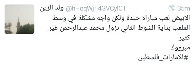 وشهدت الهاشتاقات مسميات "منصور يالأبيض" و"أحمد خليل"، و"السعودية لعبتنا"، و"محمد فوزي"، و"المنتخب الإماراتي"، "الشوط الثاني"، و"ماجد حسن"، و"محمد عبد الرحمن"؛ حيث جاءت بالمراكز الـ9 الأولى من بين أكثر هاشتاقات متداولة بالإمارات.