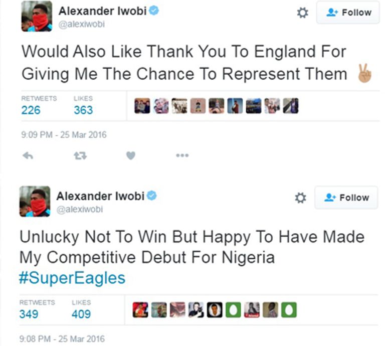 فوَّت منتخب نيجيريا الفرصة على الاتحاد الإنجليزي لكرة القدم لاستقطاب أليكس أيوبي، مهاجم أرسنال الشاب ذي الأصول النيجيرية، وذلك بعدما حاول إقناعه بتمثيل منتخب الأسود الثلاثة بدلًا من منتخب النسور الخضراء.
