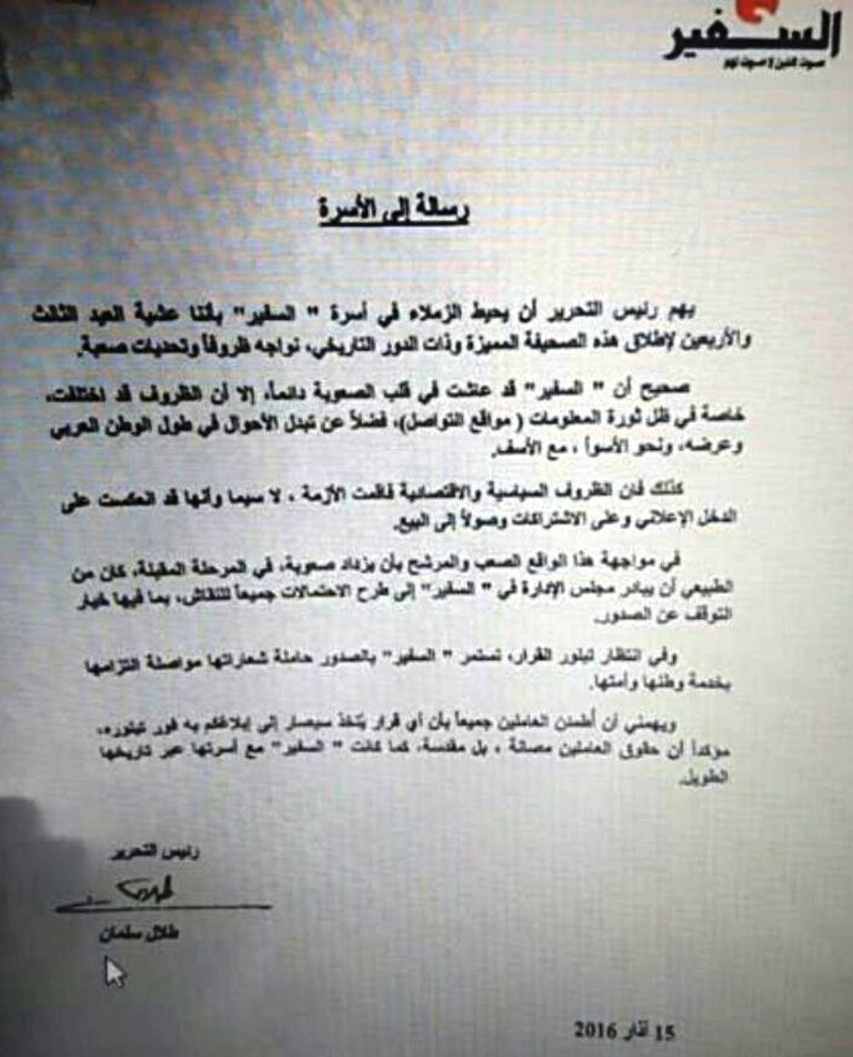 وكتب الصحافي مصطفى رعد "هذه معركة حقوقية بحتة. النوستالجيا لا تقدم ولا تؤخر عندما يرمى الصحافيون خارج المؤسسة التي ساهموا في نهضتها لا ساهمت في نهضتهم. الصحافيون أبناء المهنة لا أبناء المؤسسة. هذه المعركة تطالنا جميعا، والحال أن جميع المؤسسات معرضة للإقفال وقضم الحقوق. المرحلة المقبلة: من سيشتري السفير؟ وما قصة المليون دولار التي تعهد أحد الوزراء بدفعها للصحيفة؟ وما قصة الزيارات المكوكية لوزير العمل إلى الصحيفة؟".