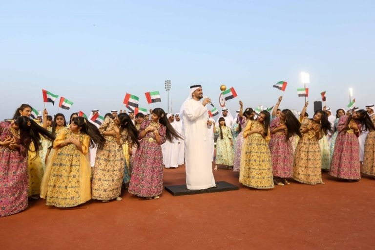 ونشر الجسمي عبّر حسابه على موقع "إنستقرام" صورة تجمعه بمجموعة من الأطفال والشباب الذين شاركوه الاستعراض الفني الضخم، وعلق عليها قائلا: "تشرفت بتلحين وغناء قصيدة صاحب السمو الشيخ محمد بن راشد آل مكتوم.. العاديات".