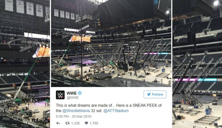 مؤسسة WWE أطلقت تغريدة بها صورة لاستاد AT&T توضح حجم العمل الضخم الذي يتم إنجازه ليصبح الاستاد جاهزا لاستقبال عرض "راسلمانيا 32"