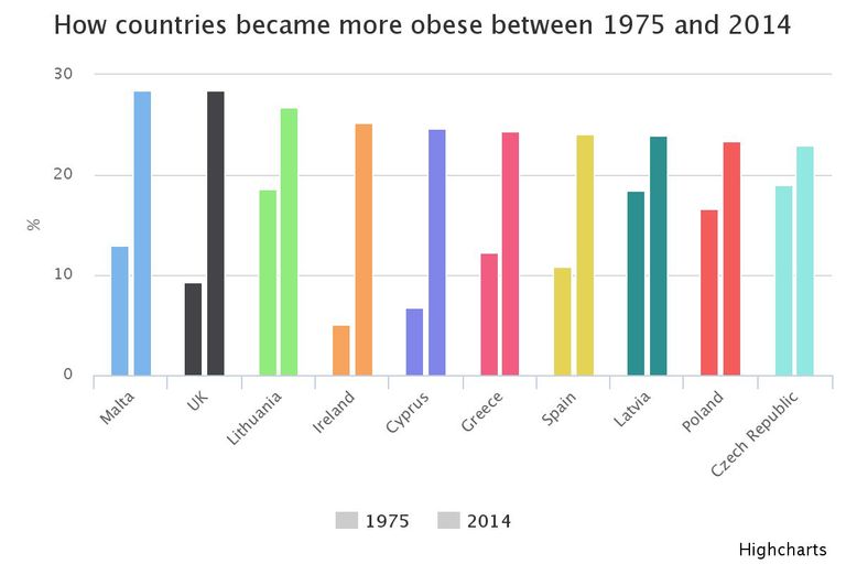 وذلك بخلاف عام ٢٠١٤، حيث كانت تشير الإحصائيات إلى أن كلًّا من مالطا وبريطانيا هم الأعلى في معدل السمنة، يليهم ليتوانيا وأيرلندا ثم قبرص واليونان وإسبانيا.