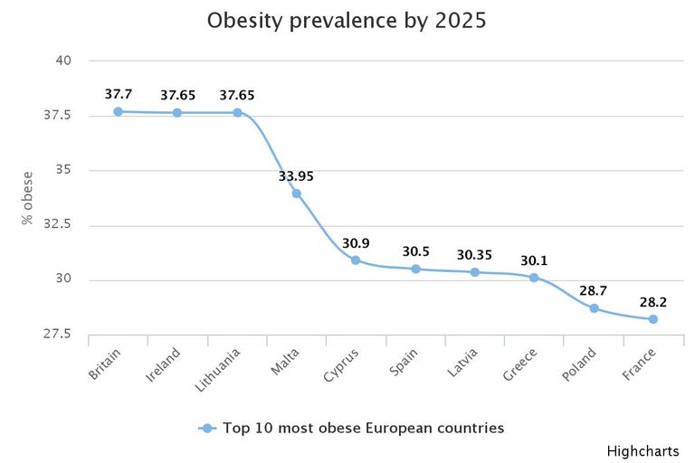 لكن الإحصائيات الجديدة، لباحثين بكلية "إمبريال كوليدج" بلندن" تشير إلى أنه خلال سنوات، سيكون لدى بريطانيا أعلى نسبة من النساء البدينة في أوروبا (٣٧.٧%)، تليها أيرلندا (٣٧%) ومالطا (٣٤%)، ثم إسبانيا (٣٠.٥%)، ثم فرنسا (٢٨.٢%)، فيما سيكون لديها أكثر الرجال بدانة جنبًا إلى جنب مع كل من أيرلندا ثم ليتوانيا (٣٦%).