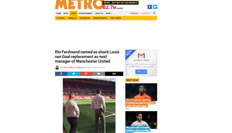 2) صحيفة "مترو" البريطانية: ريو فيرديناند سيتولى تدريب نادي مانشستر يونايتد الإنجليزي خلفاً للهولندي لويس فان جال.