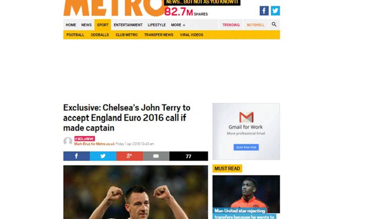 1) صحيفة "مترو" البريطانية: جون تيري يقبل العودة للعب في المنتخب الإنجليزي، شريطة موافقته على أن يكون قائد المنتخب في كأس أمم أوروبا "يورو 2016".