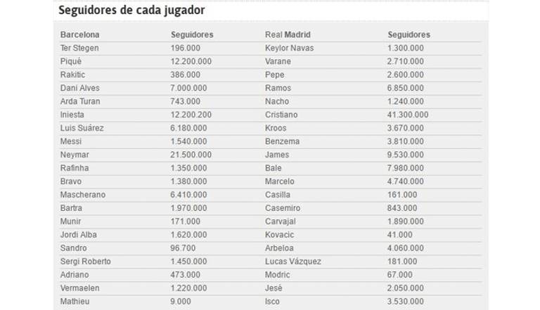 وبحسب هذه الأرقام فإن لاعبي ريال مدريد لديهم حوالي 98.553.000 متابع، بينما لاعبو برشلونة لديهم 78.094.000 متابع، أي أن لاعبي الفريق الملكي يتفوقون بفارق 20 مليون متابع.