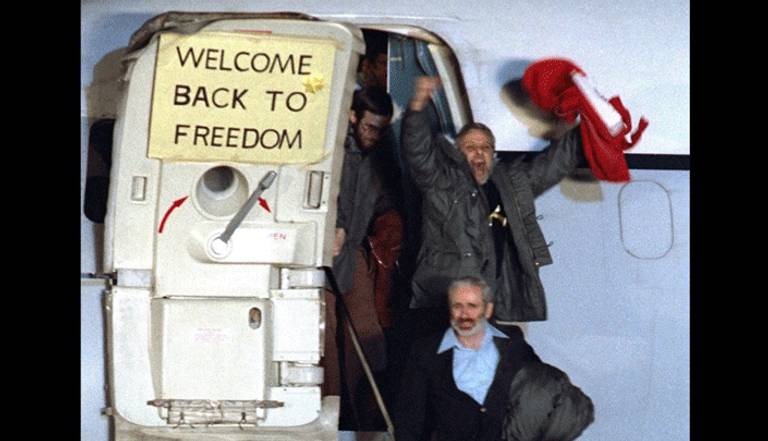 2- في نوفمبر 1979، اقتحم طلبة إيرانيون مقر السفارة الأمريكية بطهران واحتجزوا 52 رهينة أمريكية مطالبين بتسليم الولايات المتحدة الشاه الإيراني السابق محمد رضا بهلوي. تابع الملايين بأنفاس مبهورة وقائع أزمة الرهائن الأمريكيين حتى تم الإفراج عن الرهائن في 20 يناير 1981. يظهر في الصورة ديفيد رودر، أحد المحتجزين الأمريكيين ملوحا بيديه فرحا بانتهاء الأزمة والإفراج عنه.