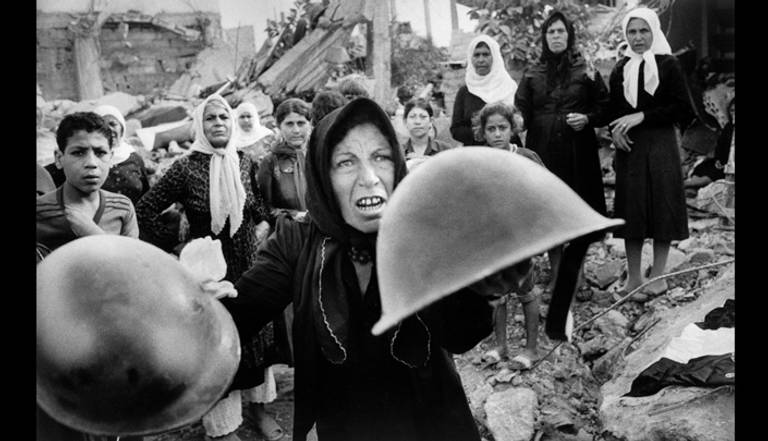 6- الصورة التي حازت على جائزة بوليتزر للمصور بيل فولي التي التقطت عدسته هذا المشهد في عام 1982، يوثق فيها صورة لامرأة فلسطينية ترفع بيدها خوذة تعتقد أنها تعود لجنود إسرائيليين قتلوا العديد من الفلسطينيين اللاجئين في مخيمات صبرا وشاتيلا في الحرب الإسرائيلية اللبنانية التي وصفت بالمذبحة الوحشية.
