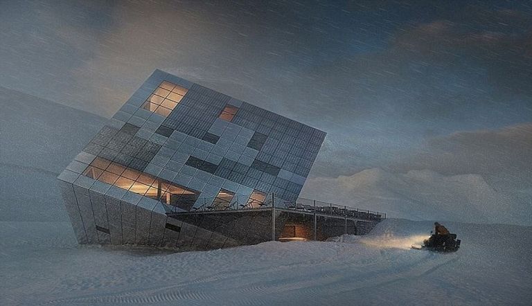 للوهلة الأولى قد يبدو أنه مكعب سقط من يد طفل في الثلج، ولكنه تصميم مذهل لكوخ حديث في جبال تاترا في شمال سلوفاكيا، وتم اختيار هذا التصميم لكي يبدو الكوخ أنه جزء من الجبال الثلجية المحيطة، وهذا التصميم مبنيّ من الألمنيوم والزجاج والألواح الشمسية.