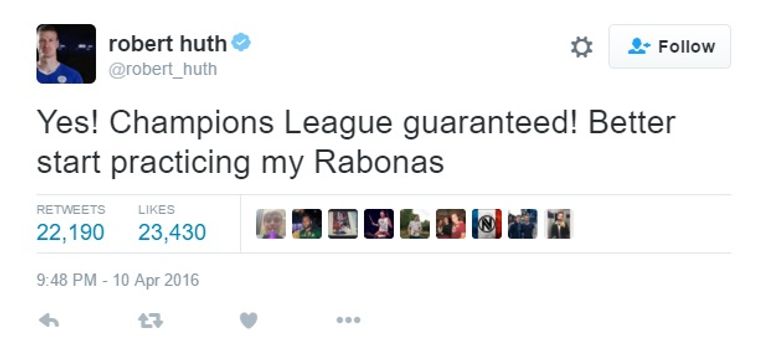عبر روبرت هوث، مدافع ليستر سيتي الإنجليزي، عن سعادته بإنجاز فريقه بضمان التأهل لدوري أبطال أوروبا، وكتب على حسابه بموقع التواصل الاجتماعي "تويتر": "نعم، ضمنا اللعب في دوري الأبطال، يجب أن أبدأ في ممارسة حركة رابونا من الآن".