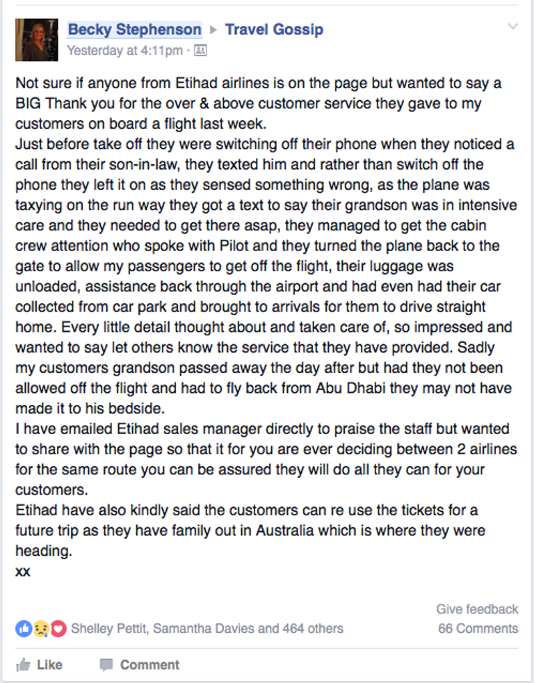 في واقعة نادرة، أوقف طيار شركة "الاتحاد للطيران" طائرته التي كانت في رحلة جوية بعد إقلاعها ليعود بها إلى أرض المطار، بعد طلب من راكبين اثنين لرؤية حفيدهما الموجود في العناية المركزة بإحدى المستشفيات، والذي ربما يلفظ أنفاسه الأخيرة.
