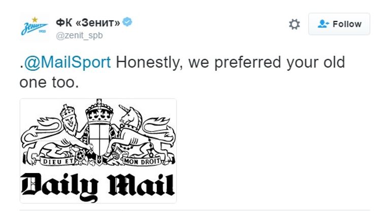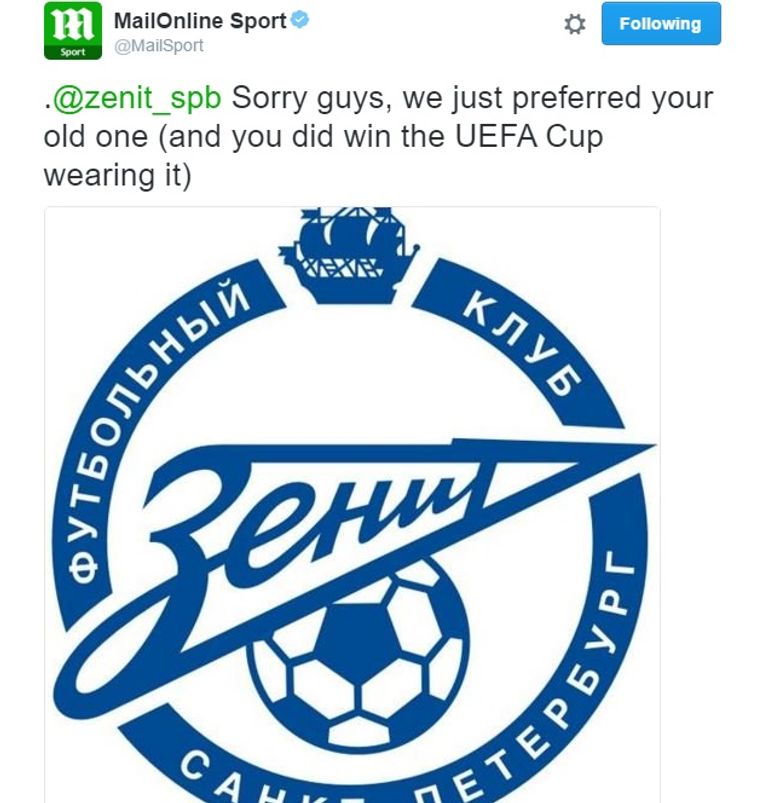 نشرت صحيفة "ديلي ميل" البريطانية تقريرًا عن أسوأ 10 شعارات لأندية كرة القدم في العالم، وأدرجت شعار نادي زينيت بطرسبورج الروسي ضمنها، وهو ما لم يقبله النادي الروسي ورد على إهانة الصحيفة البريطانية عبر حسابه على موقع التواصل الاجتماعي "تويتر".