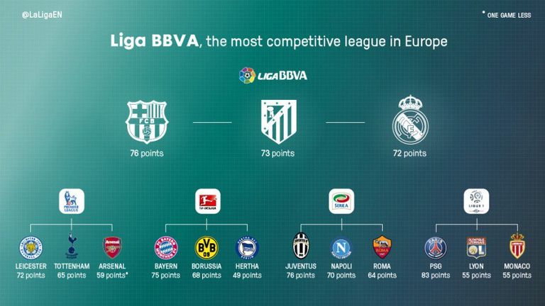 نشرت رابطة الدوري الإسباني إحصائية تثبت أنها المسابقة الأفضل بين الدوريات الأوروبية الخمس الكبرى، نظرًا لفوارق النقاط بين ثلاثي فرق الصدارة، وهي الطريقة نفسها التي اتبعها الدوري الإنجليزي قبل فترة قصيرة لإثبات أنه الأفضل على اعتبار أن الفوارق الأقل تعني تنافسية ومتعة أكثر.