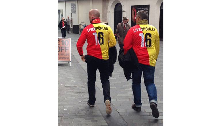 رصدت عدسات المصورن اثنين من الجماهير المتواجدة في مدينة ليفربول الإنجليزية لحضور مباراة فريق ليفربول مع ضيفه بوروسيا دورتموند الألماني وهما يرتديان قمصانا مزدوجة تجمع بين قميصي الليفر ودورتموند، وذلك قبل مباراة الفريقين في إياب الدور ربع النهائي ببطولة الدوري الأوروبي اليوم (الخميس)، في لفتة طيبة من المشجعين الذين لم يتم التعرف على انتماءاتهما.