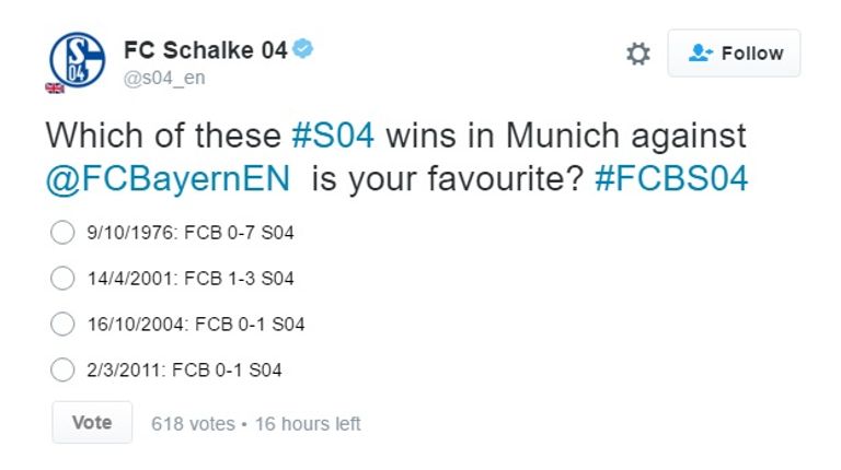 وبدأ الأمر عندما نشر الحساب الرسمي لشالكه استفتاء لمتابعيه حول أي من انتصارات الأزرق على البافاري في ميونيخ يفضلونه أكثر، ووضع 4 خيارات هي 7-0 في 1976، و3-1 في 2001، و1-0 في 2004، والنتيجة نفسها في 2011.