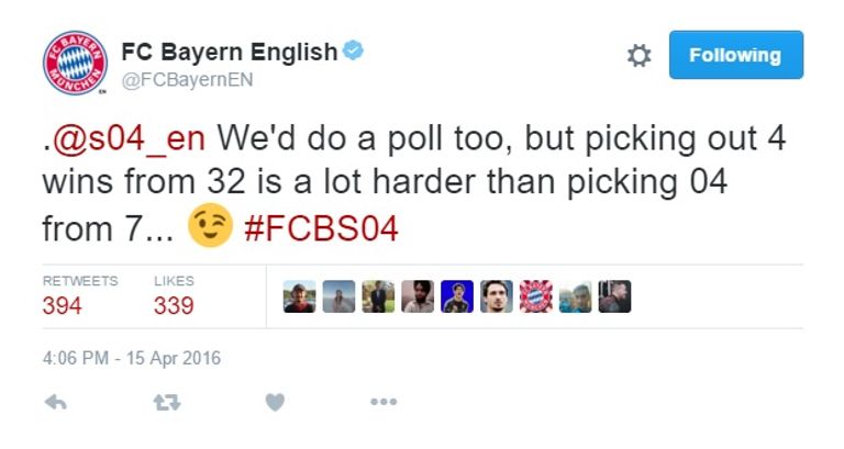 وجاء الرد سريعًا من حساب البايرن؛ حيث قال: "نود أن نجري هذا الاستفتاء أيضًا، لكن اختيار 4 مباريات من 32 أصعب بكثير من اختيار 4 من 7"، في إشارة إلى أن عدد انتصارات البايرن على أرض غريمه أكثر بكثير من عدد انتصارات شالكه في ميونيخ.