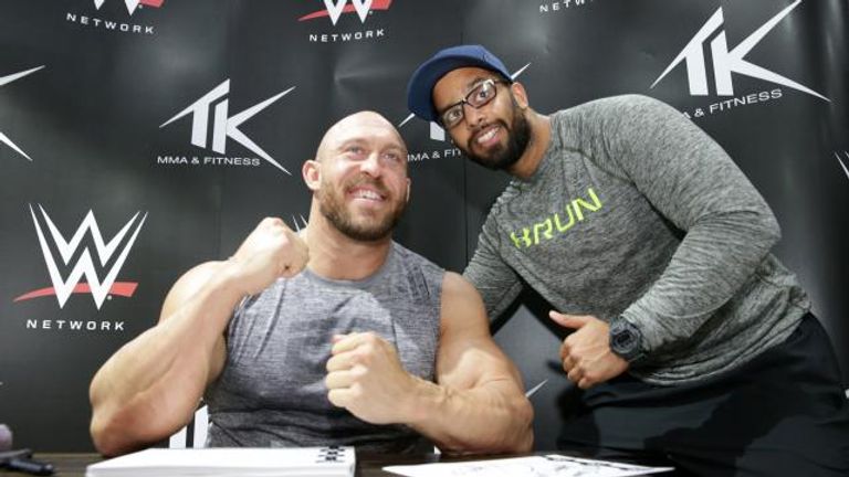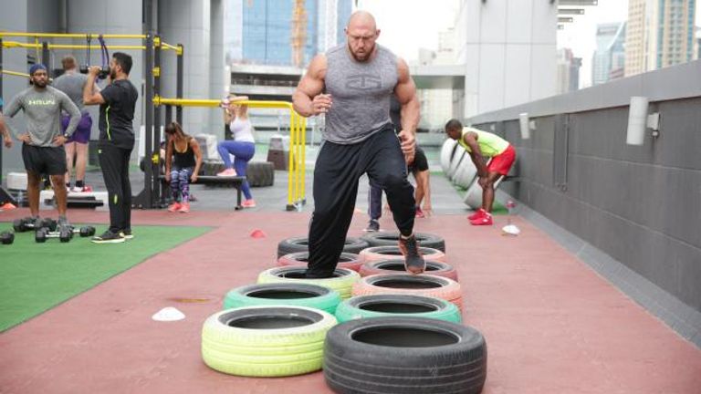 نجم المصارعة رايباك يتدرب في دبي مع مجموعة من عشاق المصارعة الحرة الذين يلتقطون معه الصور التذكارية ويحظون بتوقيعه.