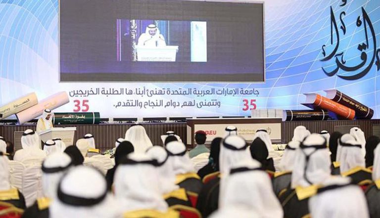 وهنأ ذوي وأولياء أمور الخريجين.. مؤكدًا أن هذه الأفواج المتعاقبة من خريجي وخريجات جامعة الإمارات يشكلون الرصيد الحقيقي والثروة التي لا تنضب لدولتنا الحبيبة بقيادة الشيخ خليفة بن زايد آل نهيان رئيس الدولة.. مشيرًا في هذا السياق إلى المراكز القيادية والمناصب العليا التي يتبوأها هؤلاء الشباب من خريجي جامعتنا الوطنية العريقة ما يؤكد صوابية الرؤية البعيدة التي كان يمتلكها المغفور له بإذن الله تعالى الوالد الراحل الكبير الشيخ زايد طيب الله ثراه؛ حين أمر بتأسيس هذا الصرح الأكاديمي الوطني قبل أربعين عامًا، لتصبح اليوم في قائمة الجامعات الإقليمية والدولية التي يشار إليها بالبنان خاصة لجهة ترسيخ البرامج البحثية والدراسات والابتكار التي تصقل شخصية الطالب ومواهبه وتصنع من خريجيها رجالًا يبنون وطنًا شامخًا عزيزًا فخورًا بأبنائه وبناته المبدعين في شتى المجالات.