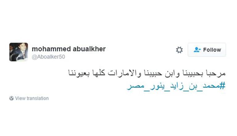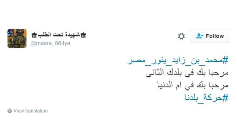 وتنوعت كلمات الترحيب بالشيخ محمد بن زايد على لسان مغردي تويتر الذين وصفوا مصر بالبلد الثاني للشيخ محمد بن زايد.