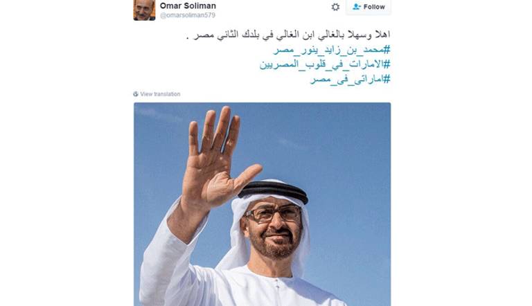 وتصدر وسم "محمد بن زايد ينور مصر" موقع تويتر في مصر، حيث تهافت الآلاف من الرواد المصريين للترحيب بزيارة الشيخ محمد بن زايد.