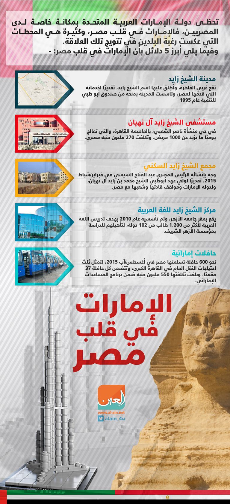 وفيما يلي إنفوجراف يظهر أبرز 5 دلائل بأن الإمارات في قلب مصر، وفي مقدمتها مدينة الشيخ زايد، التي تقع غربي القاهرة، وأطلق عليها اسم الشيخ زايد، تقديرًا لخدمات المغفور له الشيخ زايد بن سلطان آل نهيان التي قدمها لمصر.