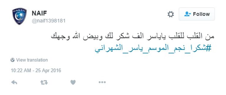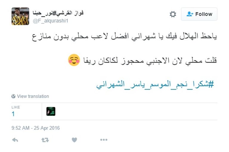 وقال مشجع اتحادي آخر يدعى فواز القرشي: "يا حظ الهلال فيك يا شهراني.. أفضل لاعب محلي بدون منازع.. قلت محلي لأن الأجنبي محجوز لكاكان ريفا".