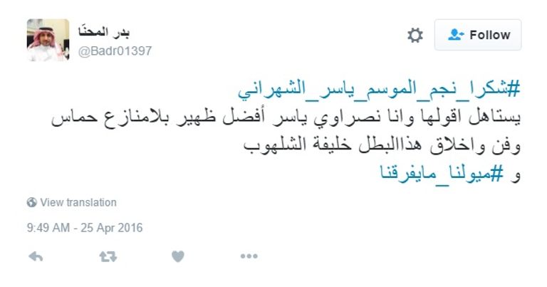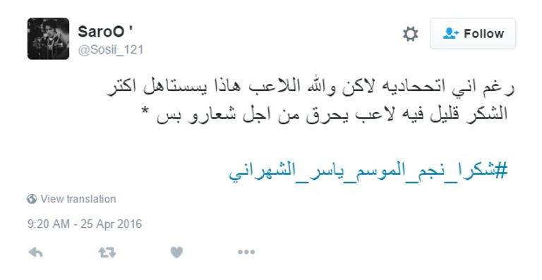 وأطلقت جماهير الزعيم هاشتاق "#شكرًا_نجم_الموسم_ياسر_الشهراني" على موقع التواصل الاجتماعي "تويتر"، وأصبح من أكثر الهاشتاقات النشطة في السعودية، للتعبير عن شكرها لنجم الفريق.