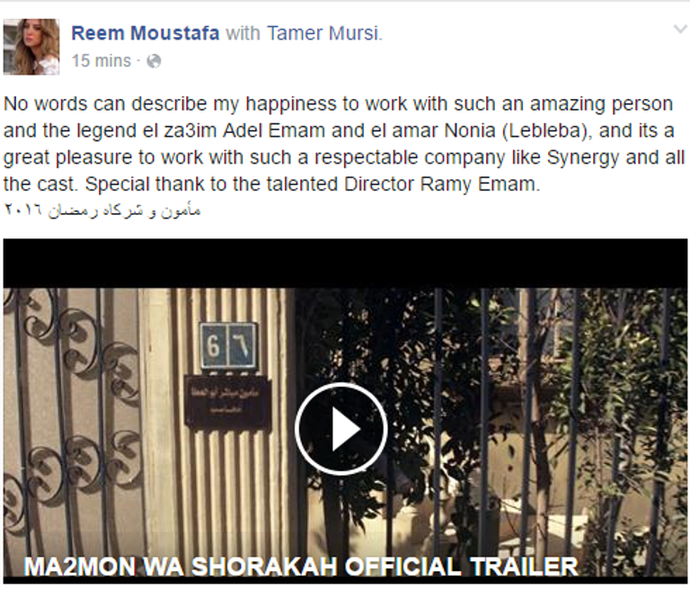 وكتبت ريم مصطفى بالإنجليزية: "لا يمكن للكلمات أن تصف سعادتي للعمل مع مثل هذا الشخص المدهش والأسطورة الزعيم عادل إمام، والقمر (لبلبة)، استمتعت كثيرًا بالعمل مع هذه الشركة المحترمة، وشكر خاص لمدير الموهوبين رامي إمام".