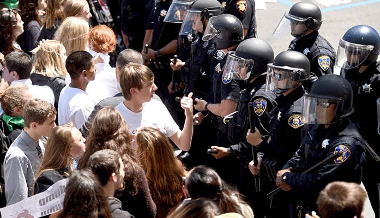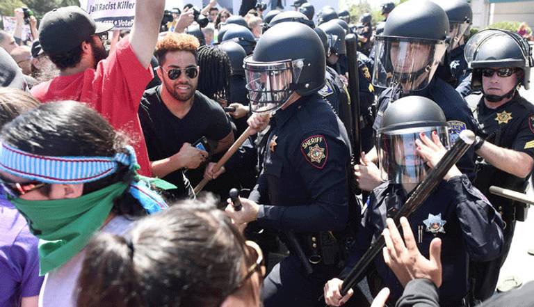 وقعت مناوشات بين متظاهرين وشرطة مكافحة الشغب الأمريكية الجمعة أمام فندق في كاليفورنيا حيث ألقى دونالد ترامب المرشح الجمهوري الأوفر حظا في الانتخابات الرئاسية الأمريكية خطابا، ما أجبره على استخدام مدخل خلفي.