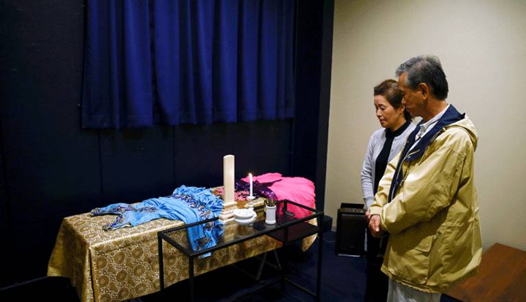وقالت هيروكازو هوساكا أمام جثمان والدتها الموضوع في نعش مزخرف في سوسو "من الرائع أن يحضر أفراد العائلة والمعارف إلى هنا ويزورونها قبل نقلها إلى المحرقة."