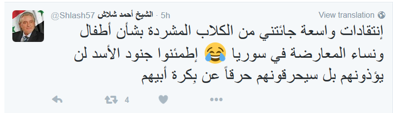وردًا على الانتقادات الواسعة التي أثارتها كتاباته، رد الشلاش "انتقادات واسعة جاءتني من الكلاب المشردة بشأن أطفال ونساء المعارضة في سوريا، اطمئنوا فجنود الأسد لن يؤذونهم بل سيحرقونهم حرقًا عن بِكرة أبيهم".