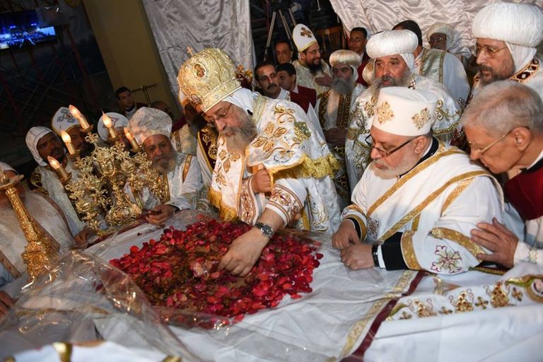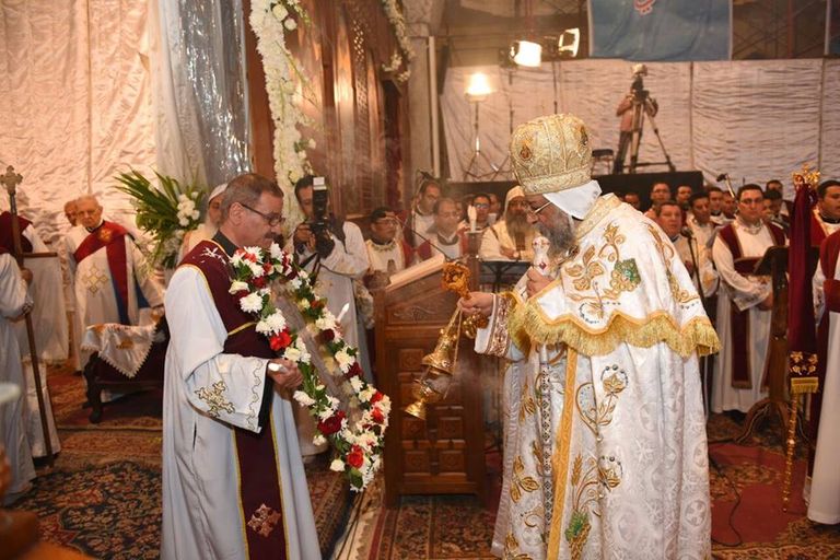 وقام البابا تواضروس بالمرور وسط القاعة حاملا مبخرة لمباركة الحضور الذين قابلوه بإلقاء الزهور قبل أن يعود للهيكل.