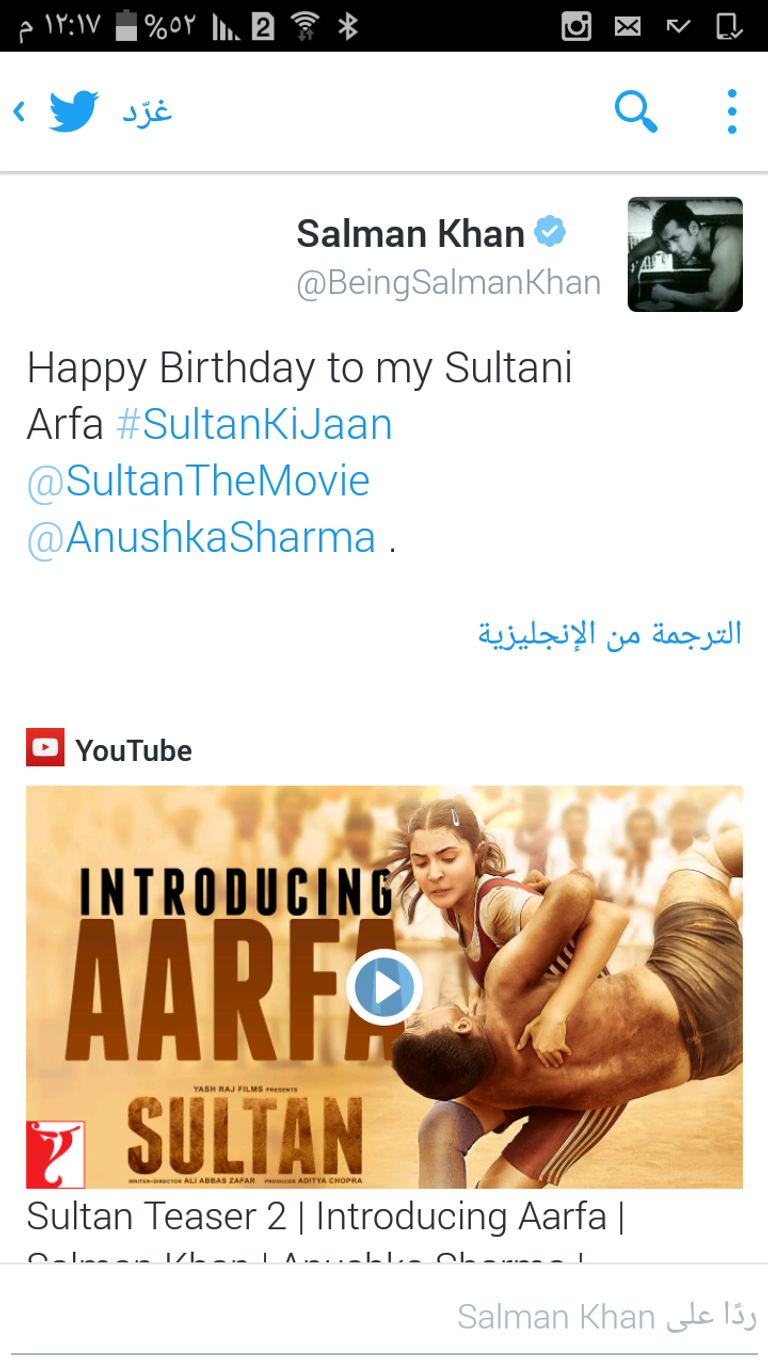 وكتب سلمان خان عبر حسابه على موقع "تويتر"، "عيد ميلاد سعيد لسلطانتي أرفا"، في إشارة إلى الدور الذي تلعبه أنوشكا في الفيلم الذي يجسد فيه سلمان دور الملاكم "سلطان" بينما تجسد أنوشكا دور الملاكمة "أرفا".