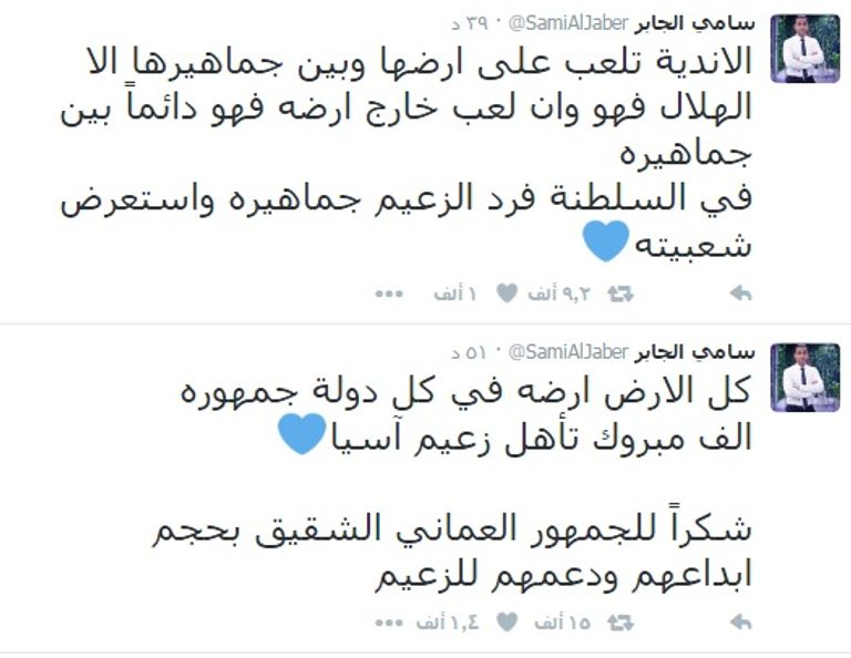 وكتب الجابر تدوينة عبر حسابه الرسمي على موقع التواصل الاجتماعي "تويتر": "الأندية تلعب على أرضها ووسط جماهيرها، إلا الهلال فهو دائمًا بين جماهيره، حتى إذا لعب خارج أرضه، واستعرض اليوم شعبيته الكبيرة في سلطنة عمان".