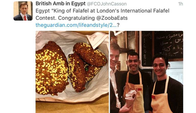 السفير البريطاني بالقاهرة، جون كاسين، يهنئ الفريق المصري الفائز ببطولة العالم في الفلافل، بطريقة خاصة حظيت بإعجاب المصريين..ماذا قالوا؟