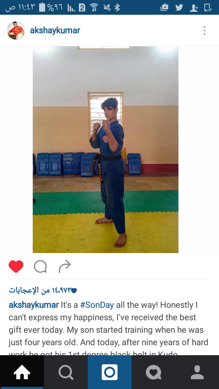 ونشر نجم الأكشن في بوليوود صورة لابنه أثناء التمرين على حسابه بموقع "أنستقرام"، معلقًا: "لا أستطيع أن أصف سعادتي، اليوم تلقيت اجمل هدية من ابني، حصل على الحزام الأسود في الجودو والكاراتيه".
