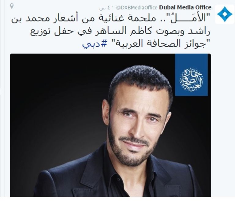 وقال المكتب الإعلامي "الأمل.. ملحمة غنائية من أشعار محمد بن راشد وبصوت كاظم الساهر في حفل توزيع جوائز الصحافة العربية".
