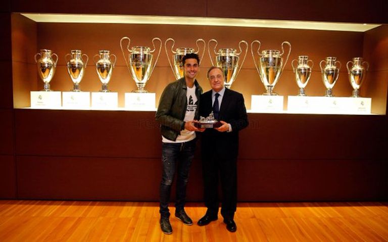 فلورنتينو بيريز رئيس نادي ريال مدريد الإسباني، يقوم بتكريم لاعبه ألبارو أربيلوا بعدما خاض آخر مباراة له على ملعب سانتياجو برنابيو.
