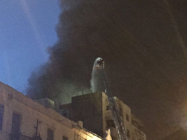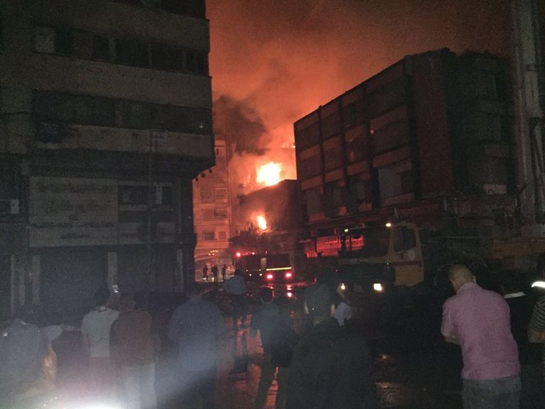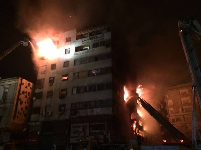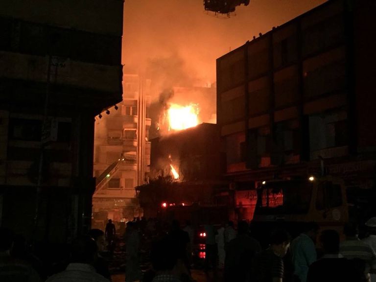 حريق ضخم شب في وسط القاهرة التهمت النيران فيه فندقًا من 6 طوابق ونحو 200 محل تجاري