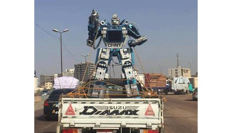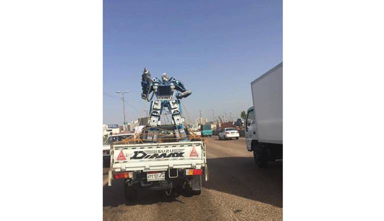 تداول نشطاء على مواقع التواصل الاجتماعي صورًا تشبه الإنسان الآلي "الريبوت" محمول على سيارة نصف نقل على أحد الطرق السريعة بمصر.