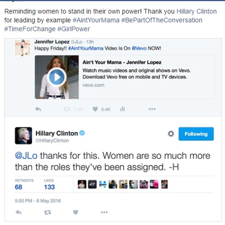 وشاركت المرشحة الديموقراطية لانتخابات الرئاسة الأمريكية هيلاري كلينتون رابط الأغنية عبر حسابها الشخصي بموقع "تويتر" موجهة رسالة شكر لـ"لوبيز".