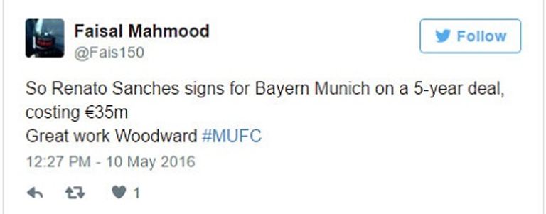 وكتب مشجع عربي للفريق يدعى فيصل محمد، بلهجة ساخرة أيضاً: "ريناتو سانشيز وقع مع بايرن ميونيخ لمدة 5 سنوات مقابل 35 مليون يورو، عمل عظيم وودوارد".