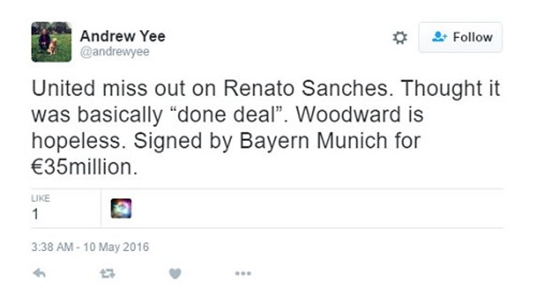 وسار أندرو يي على نفس النهج، وكتب: "يونايتد أضاع صفقة ريناتو سانشيز، التي كان يعتقد أنها محسومة.. وودوارد شخص ميؤوس منه، لقد وقع لبايرن ميونيخ مقابل 35 مليون يورو".