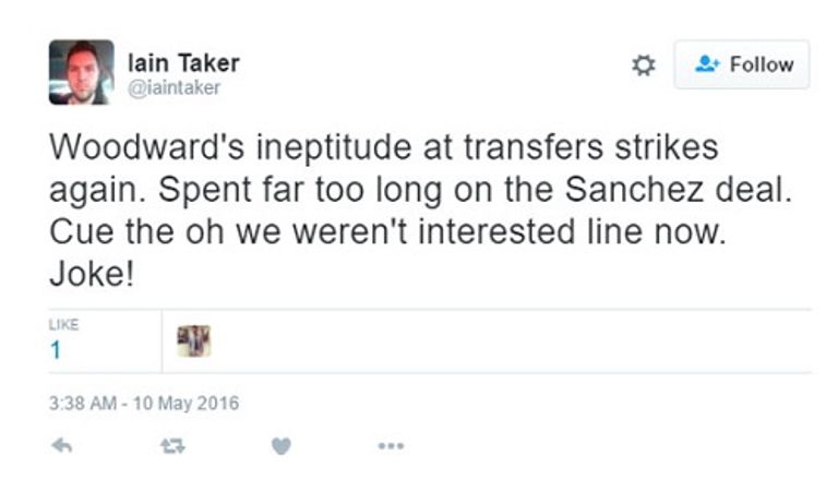 وكتب ايان تاكير: "سخافة وودوارد في الانتقالات تظهر مرة أخرى، لقد أمضى وقتًا طويلًا جدًا على صفقة سانشيز، ما حدث نكتة!".