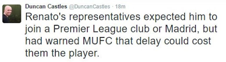 وكتب دنكان كاستلز، الصحفي بجريدة "تايمز" البريطانية على، "تويتر": "ممثلو ريناتو توقعوا أن ينتقل اللاعب للدوري الانجليزي الممتاز أو مدريد، لكنهم أيضًا حذروا مسئولي يونايتد من أن تأخرهم سيكلفهم ضياع الصفقة".
