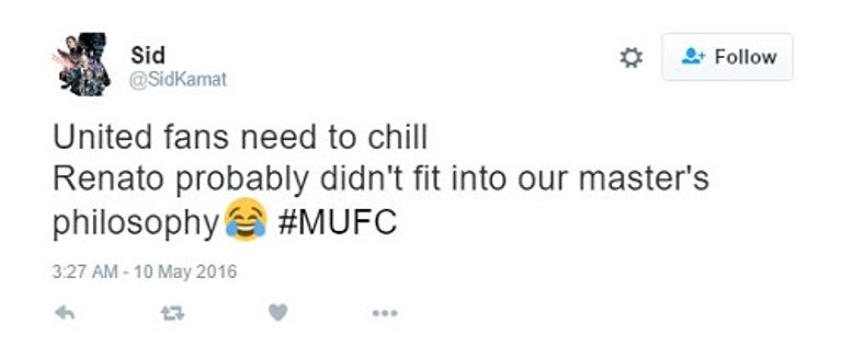 وسخر حساب يدعى "سيد كامات" من طريقة إدارة وودوارد للأمور في يونايتد، قائلاً: "يبدو أن ريناتو ربما لا ينسجم مع فلسفتنا العريقة".