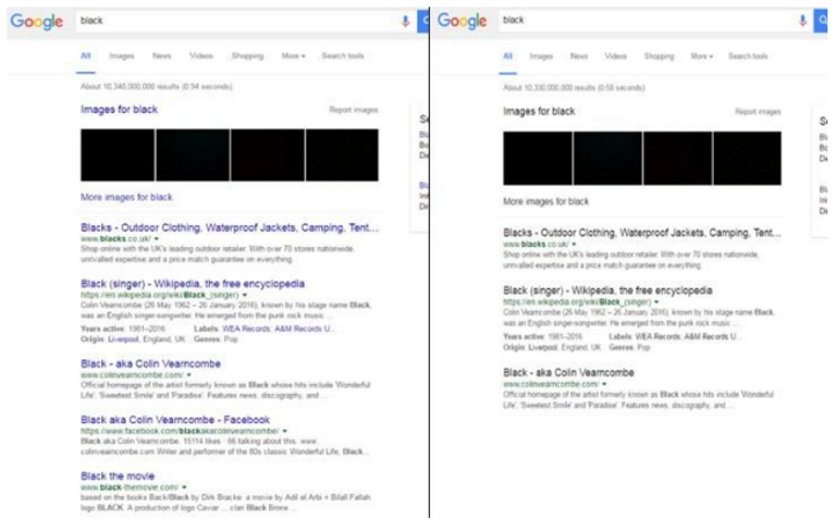 ذكرت صحيفة «التليجراف» البريطانية، أن الشركة على ما يبدو تُجري اختبار تفضيل للروابط السوداء، وتعمل هذه الاختبارات على أن تحل أسماء نتائج البحث السوداء محل الزرقاء ولكن يبقى النص وعناوين الرابط دون تغيير، لتكون سوداء وخضراء على التوالي.