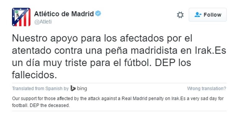 وكتب حساب الأتليتي: "نظهر دعمنا الكامل لضحايا الهجوم الذي واجهته رابطة ريال مدريد في العراق.. إنه يوم حزين في تاريخ كرة القدم.. ارقدوا في سلام".