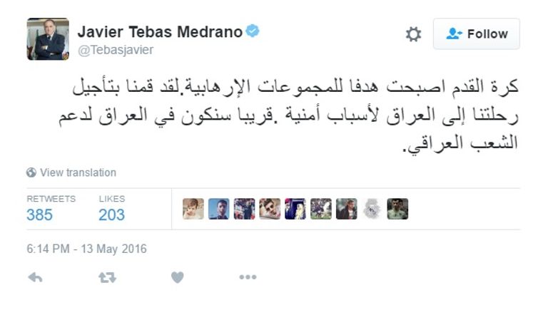 كذلك عبر خافيير تيباس رئيس رابطة الدوري الإسباني عن صدمته، وكتب على حسابه بموقع "تويتر" تغريدتين باللغة العربية يقول فيهما: "صدمت اليوم بالهجمة الإرهابية التي استهدفت نادي مشجعي ريال مدريد في العراق.. نحن مع الضحايا وأسرهم، نسأل الله أن يرحمهم".